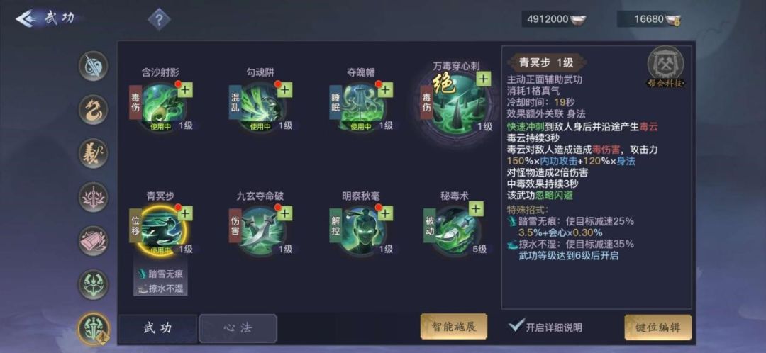 NO4:青冥步/明察秋毫,青冥步是位移技能,快速冲刺到敌人身后,沿途还能造成毒伤。