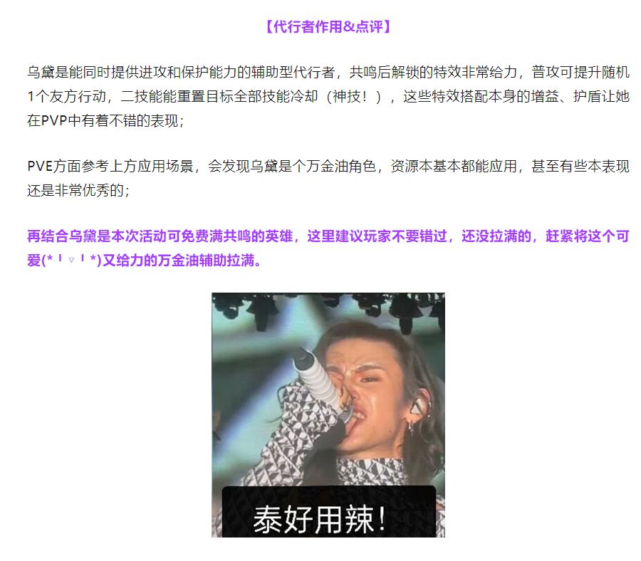 小屋的朋友们好啊,这里是夜莺,今天给大家带来的是3.2.2版本活动兑换的闪耀四星角色乌黛的测评。