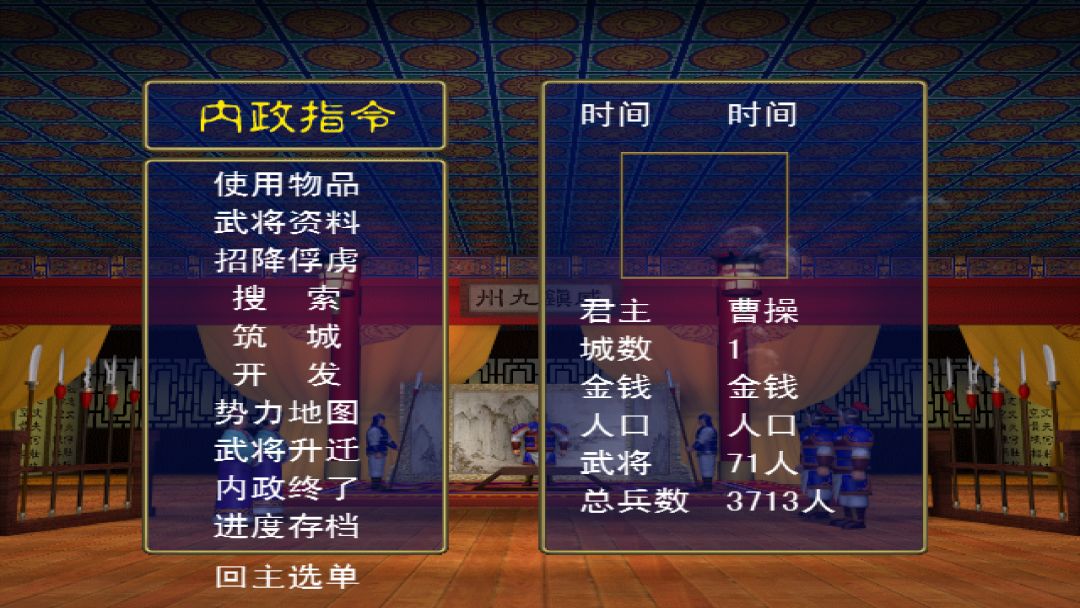 1、内政模式为每年一次,2、地图模式是以月来计算的,每12月转换为内政模式,3、战争模式则为每敌我一战限99秒钟的时间。游戏进行的流程即是三者的循环。