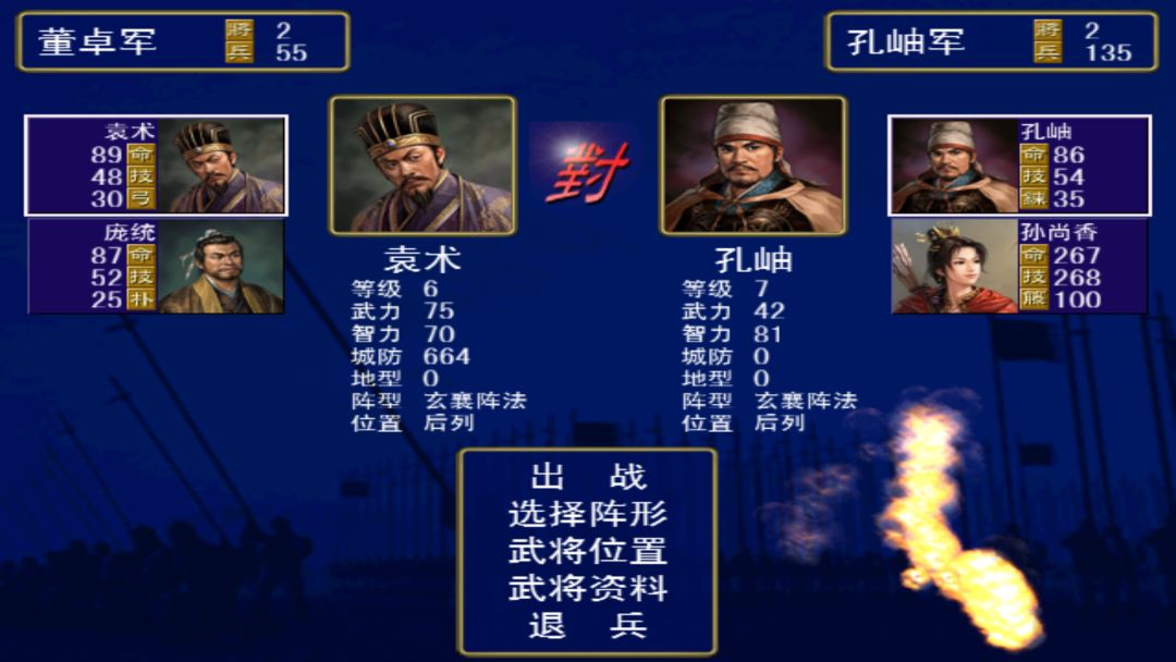 3、当你的部队和敌方部队碰面,或你的部队攻城,再或对方部队攻你的城,就会进入战争模式,该模式是以淘汰制形式,当某一方面武将全部败北,则可以判定胜负。开战的时候,双方各选出一队伍进行PK,当一方的武将HP为0或者逃跑了,就算另一方胜利,当时间为0时,则判定双方平手。胜利主要的依据有:1武将能力 2武将技 3部队质量 4兵种相克