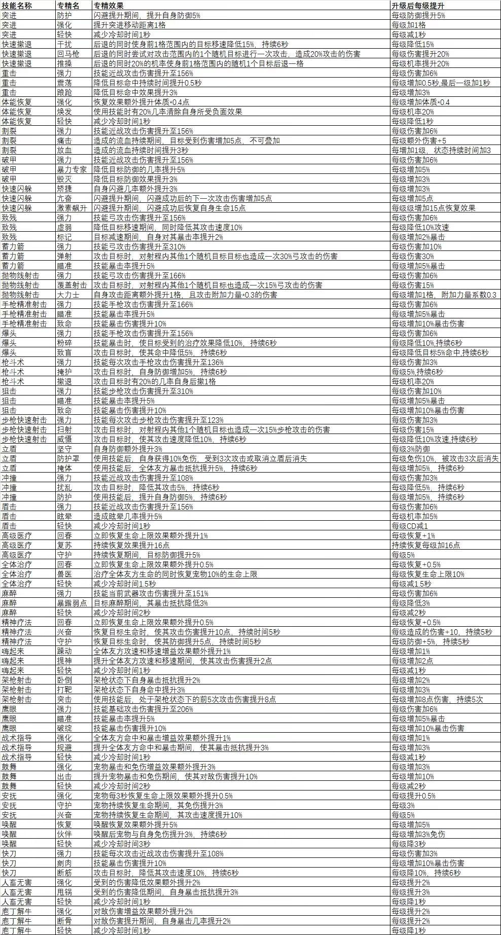 全技能专精效果一览
