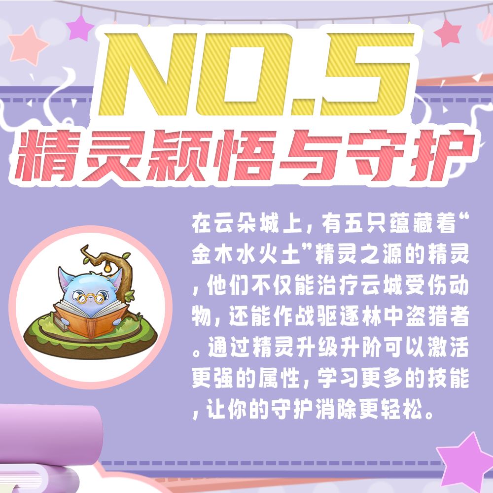 在云朵城上,有五只蕴藏着“金木水火土”精灵之源的精灵,他们不仅能治疗云城受伤动物,还能作战驱逐林中盗猎者。通过精灵升级升阶可以激活更强的属性,学习更多的技能,让守护消除更轻松。