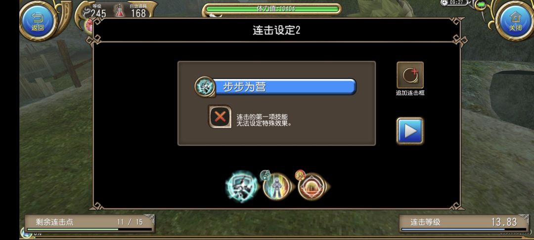 开启修罗状态所有技能蓝耗+100,结算于连击之前,蓝耗减半效果之后。举个例子,修罗状态下,裸放冲击波(300)+破坏者(600/2+100=400)=700,共消耗蓝量700。在连击里,步步为营+祈祷(补位)+冲击波(增幅)是200蓝,计算过程为步步为营(200)+祈祷(600补位)-冲击波(300*2)=200。具体可自行测试,并配置连击,具体连击教程不在这里展开讲述。