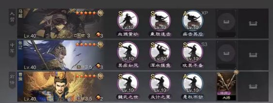 带上这个战法可以有效增加打肉队、流氓的效果。马超士气分分钟到一百八。当然打法刀、内战还是要看运气分兵因为不触发叠士气,可以选择不带,竭地锋镝剧本马超有白马义从自带分兵还会更强 顶配配置。