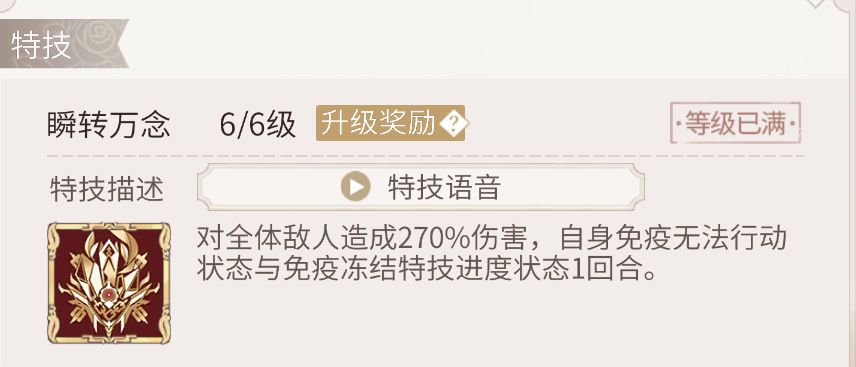 提升效命+效闪+残血回血(数值一般)+高血平A概率禁特和退条。自身能将概率提升至约50%,此效果搭配特技禁特,可在一定程度上延缓敌方开大频率。