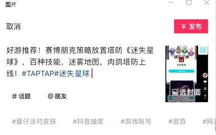 复制指定文案,分享截图或视频到抖音,文案中需带有话题#TAPTAP#迷失星球 标签并设置为公开,『发布成功后截图并发在评论区』,即可参与活动!
