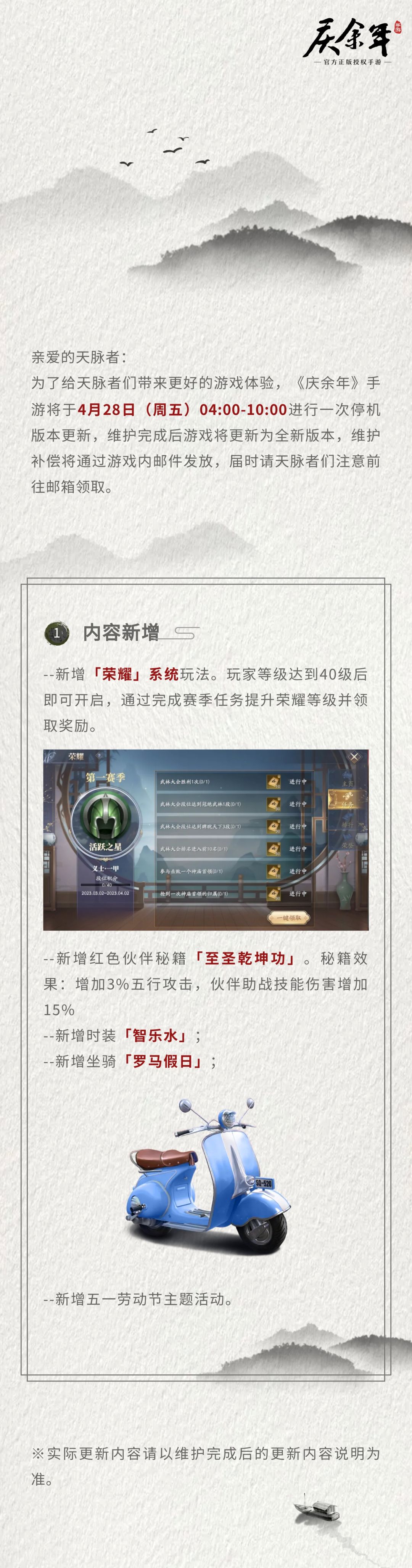 各位天脉者们好,五一假期将至,节前恰逢停机维护,请大家安排好游戏时间哦~