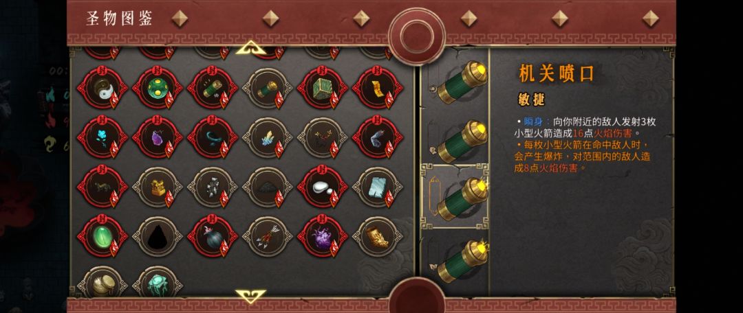 常规建议选机关喷口和猪心开局,喷口是必备的,后面来啥圣物换啥就好了。秘籍基本上不挑,常规拿加伤害的就行,没有加伤害的,就拿攻速和收剑冷却,一样可以吃到加成。