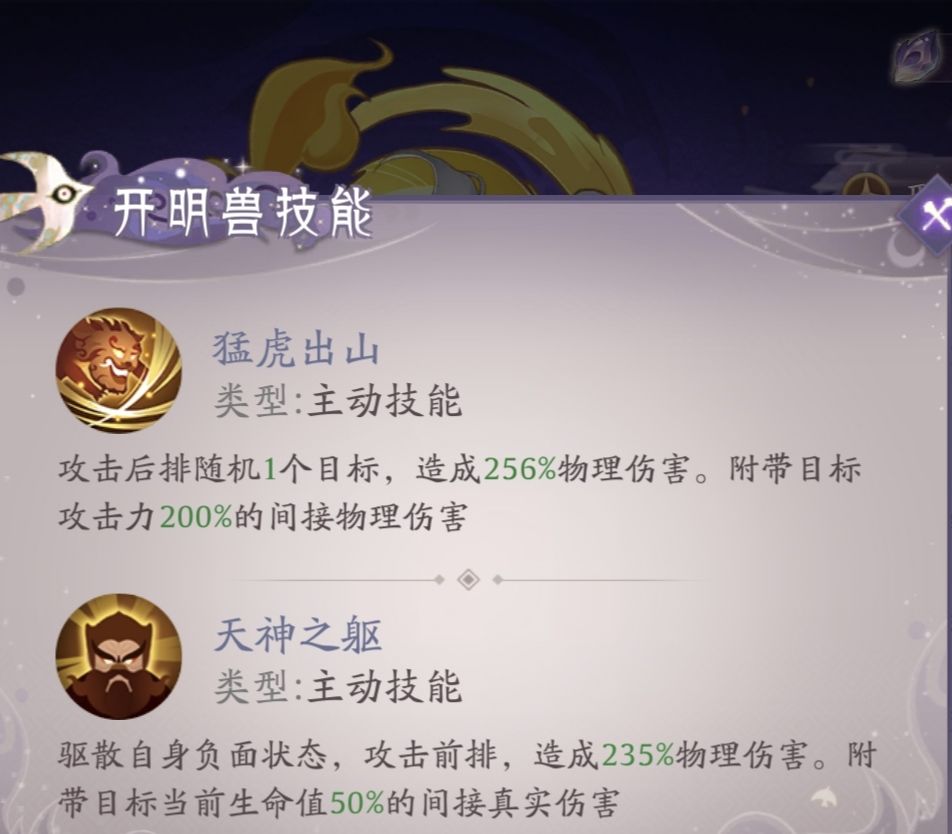 开明兽每回合会引爆他们身上的诅咒和灼烧,引爆诅咒影响最大的是女魃,而引爆灼烧就是在针对朱雀了,侥幸逃过一劫的腾蛇本该表现亮眼,但是敌方目标仅有三个,对巫祝腾蛇来说仍是比较吃亏的,所以实际表现还不如自带50%攻击buff女魃
