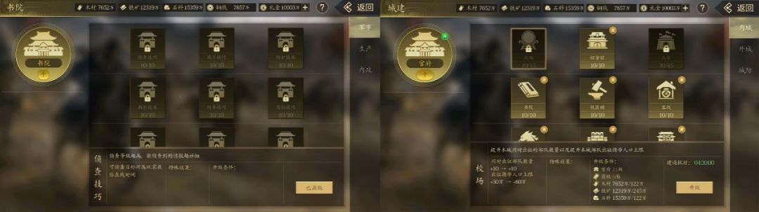 1、攻占之前:在书院中将相关军事技巧提升到满级,提升军队属性。在城建中提升校场等级,提升可出征兵力。