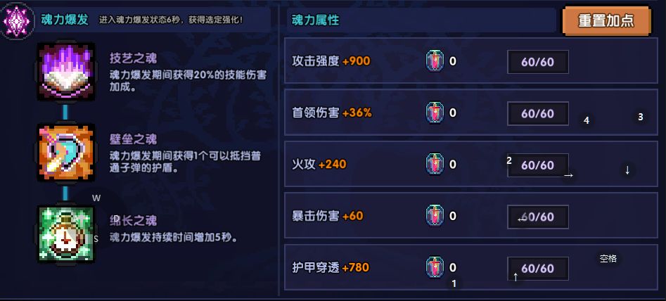 对于魂点不够用的同学,在满足穿透和暴击的前提下,各项属性平均分配点取,或者可根据自己面板来自己调整加点