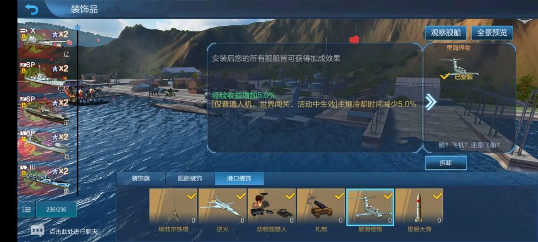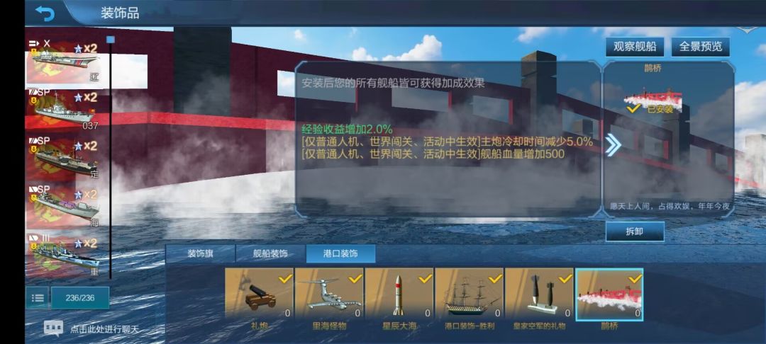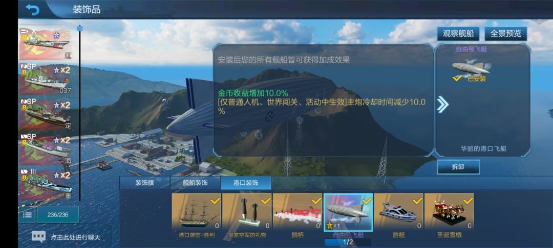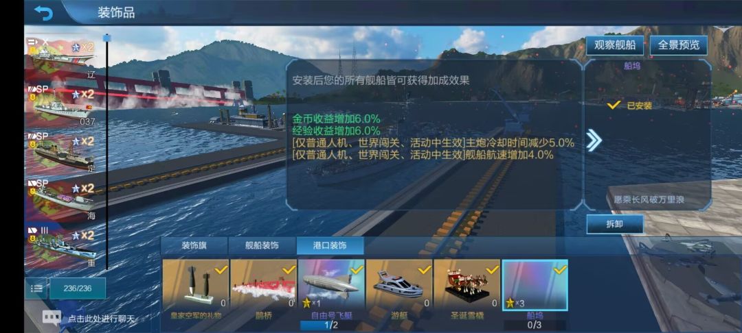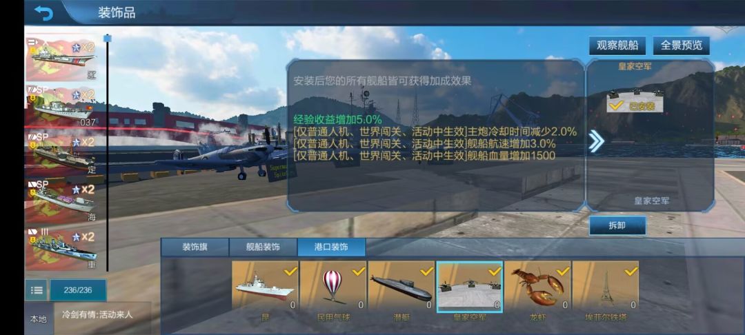 如图所示,基本上好拿的还通用的就彩色五角星了,其他的多多少少有点难搞,因为不是绝版旗子绝版装饰品就是飞艇这种看运气。最耗时间的就是9个船坞,虽然理论上能白嫖,但少说连着吃一年多才能吃出来,不过可以请代吃(非常的新鲜非常的美味)其他的港口装饰品+2%皇家空军+5%的鹊桥+5%的里海怪物,有就有没有就没有了(俺寻思大抵是绝版了)