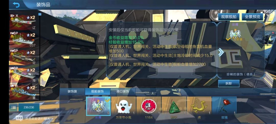 不好搞得:司令旗子,一个+3%一个+5%(+5%的没有,悲)剩下的就是港口装饰品。