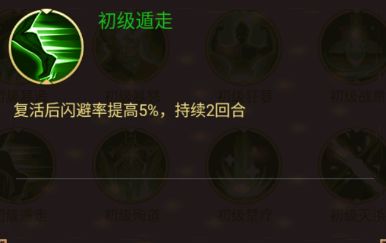 战法-遁走(初/中/高/特级遁走,复活后闪避率提升5%/10%/15%/20%+持续2回合)