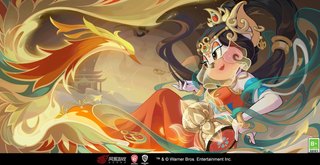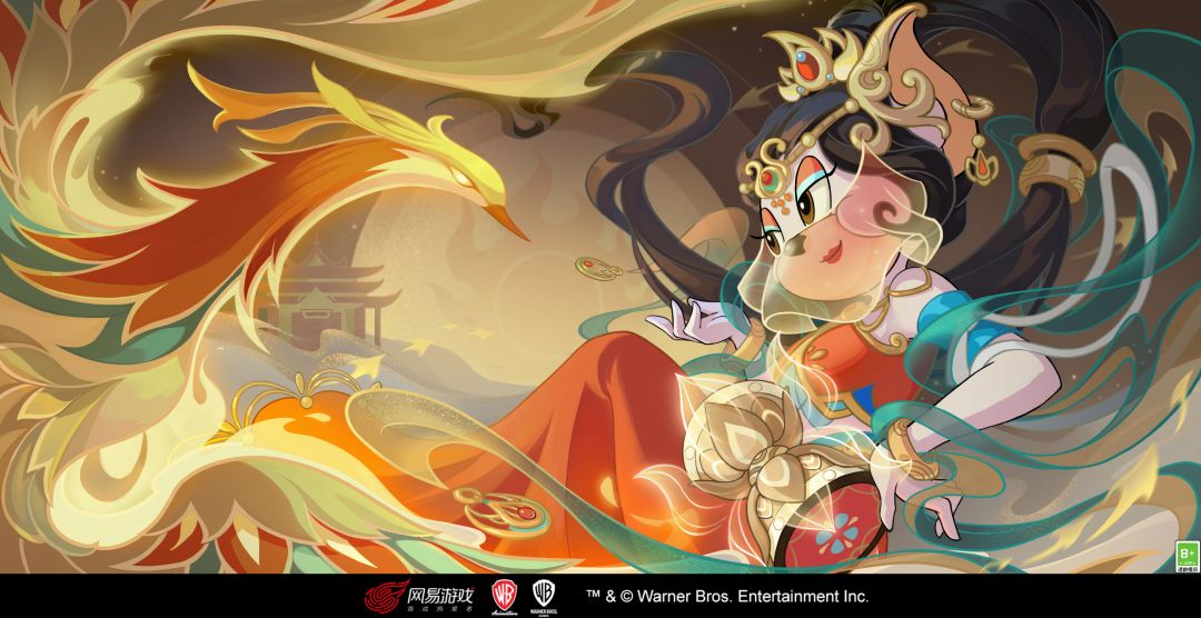 在背景设计上,把仙界宝镜和振翅欲飞的火凤作为背景,突出主题的同时,又和角色皮肤相得益彰。