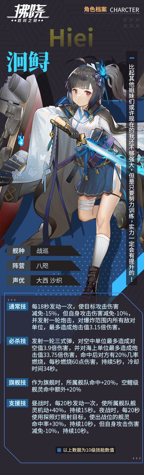姐妹中排行老二,表面看起来是个特别佛系清冷的姑娘,其实内心是一团火。在建造后由于条约关系就受限改为练习战舰拆除了四号炮塔和一个烟囱,成为御召舰,因此服役生涯相对比其他姐妹们要轻松一些,但对她而言则像是被踢出了主力队伍一般难以忍受,因此为了加强认同感和存在感。
