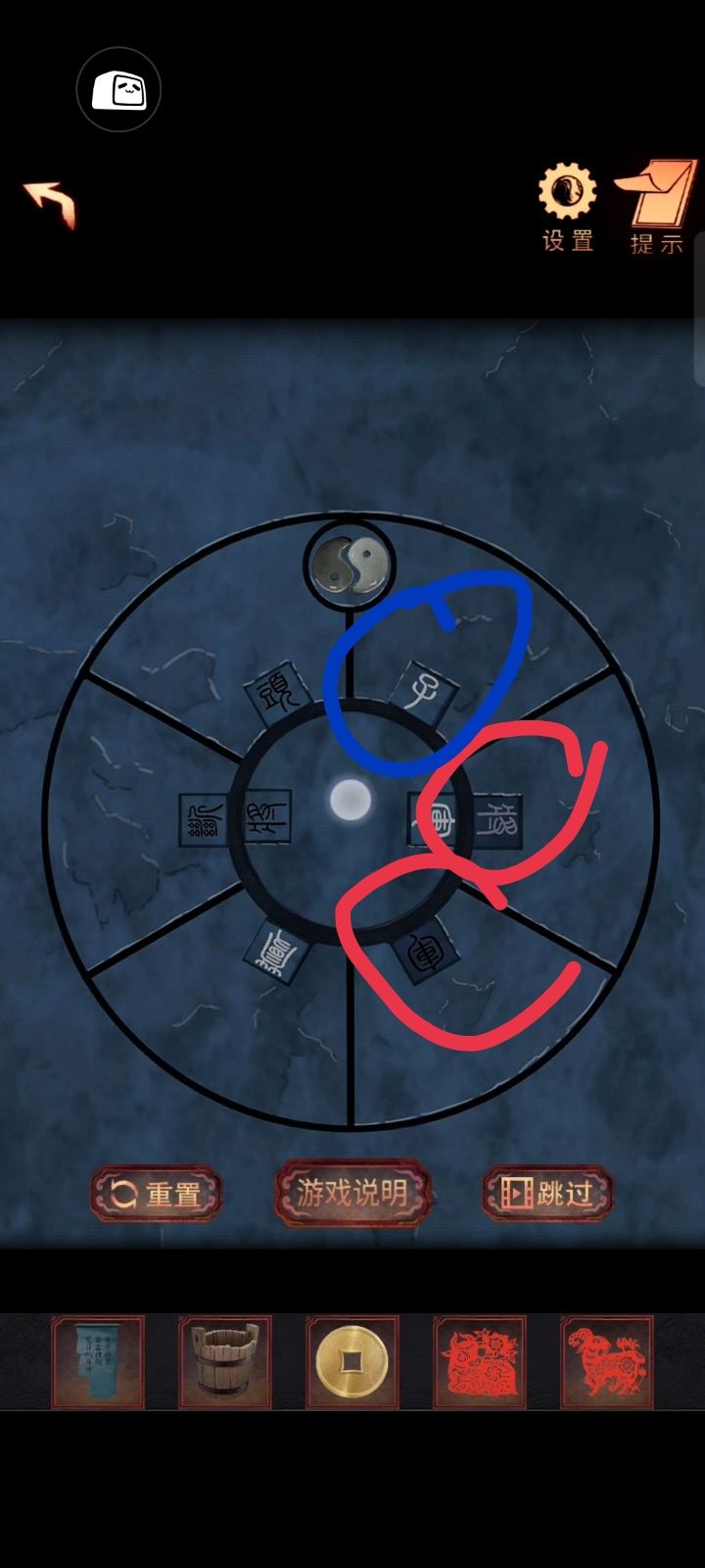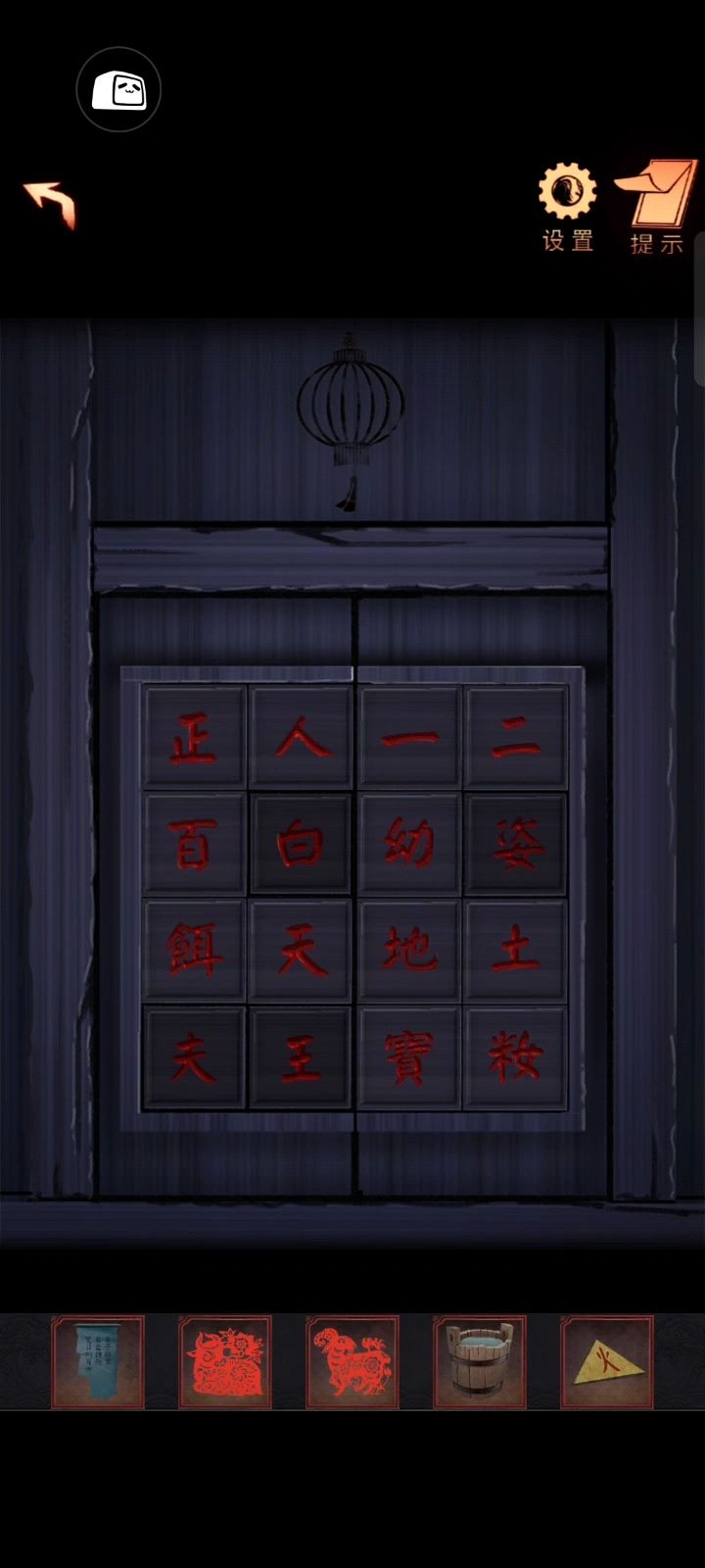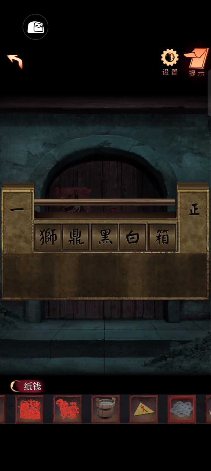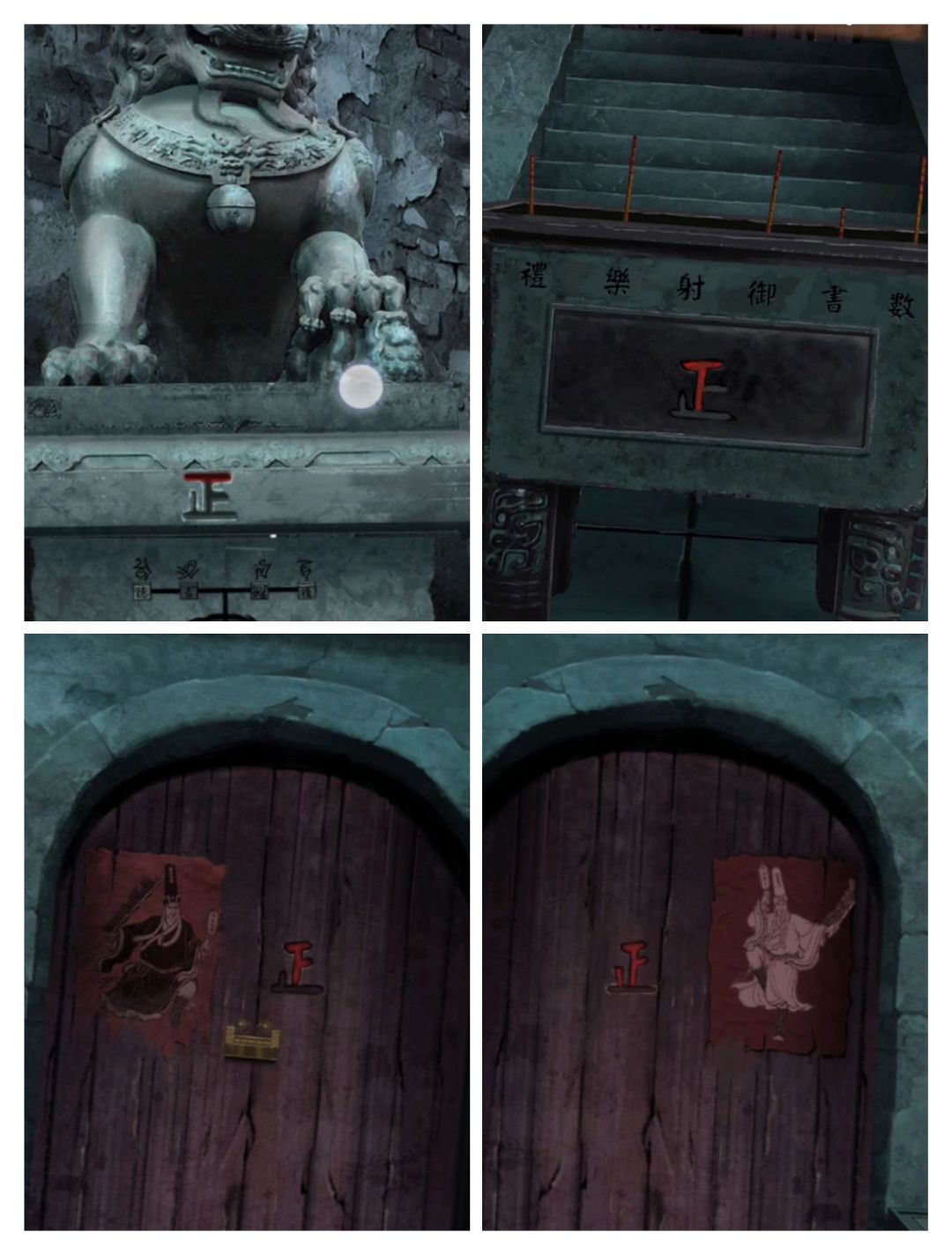 探索完差不多整个庙后,看到四个正字,红色为笔画顺序,按照顺序可知是狮鼎黑白,(最后一个字我没看到)但是可以通过穷举法得出最后一个字是箱。锁在黑色道长门贴的大门