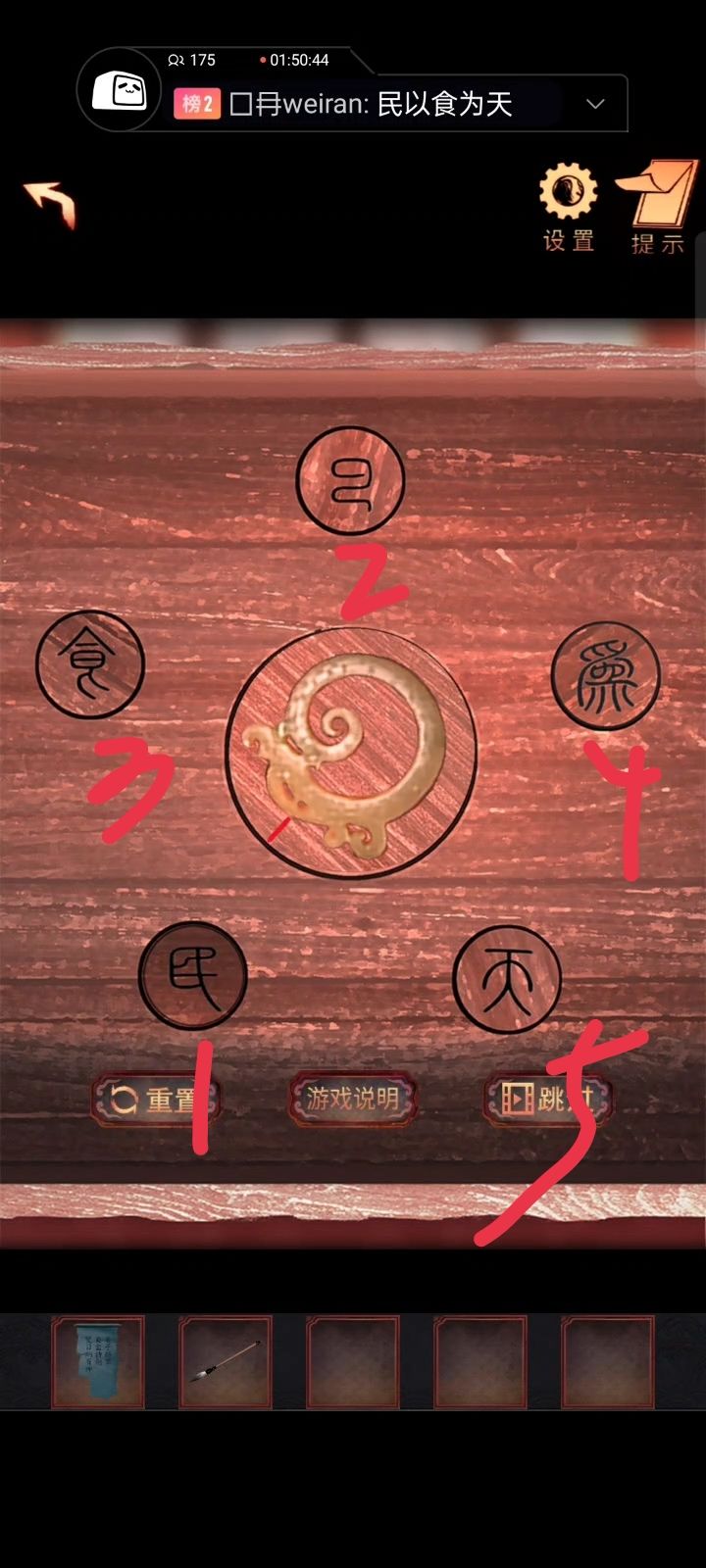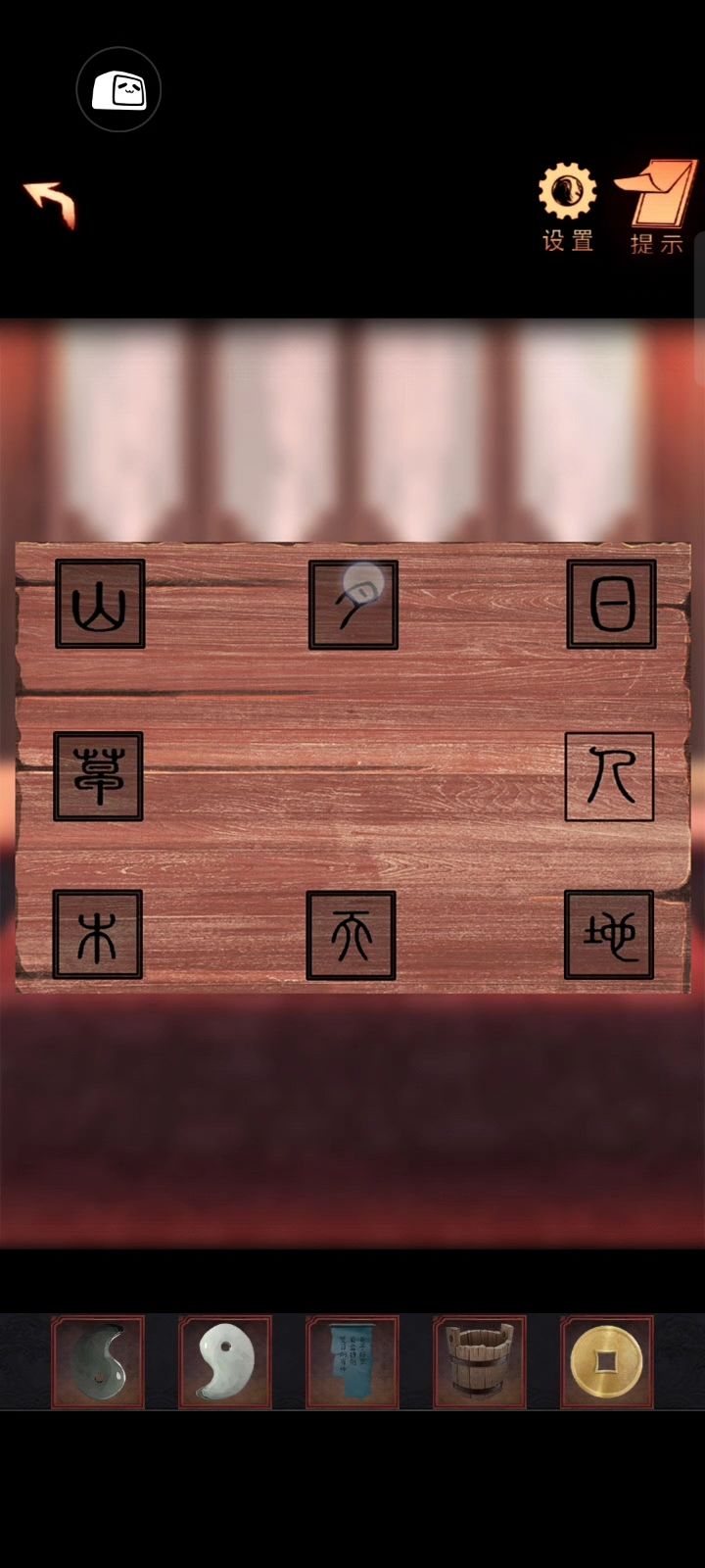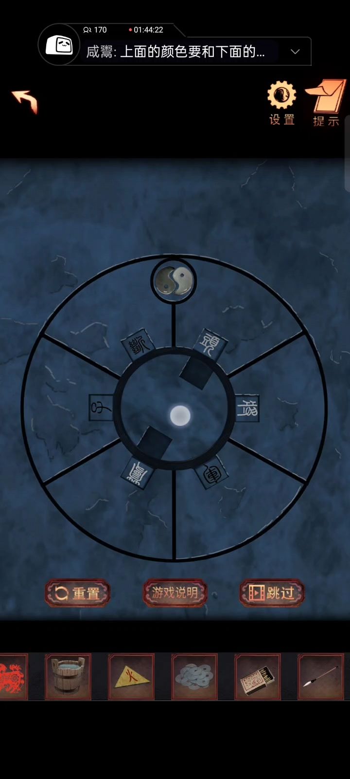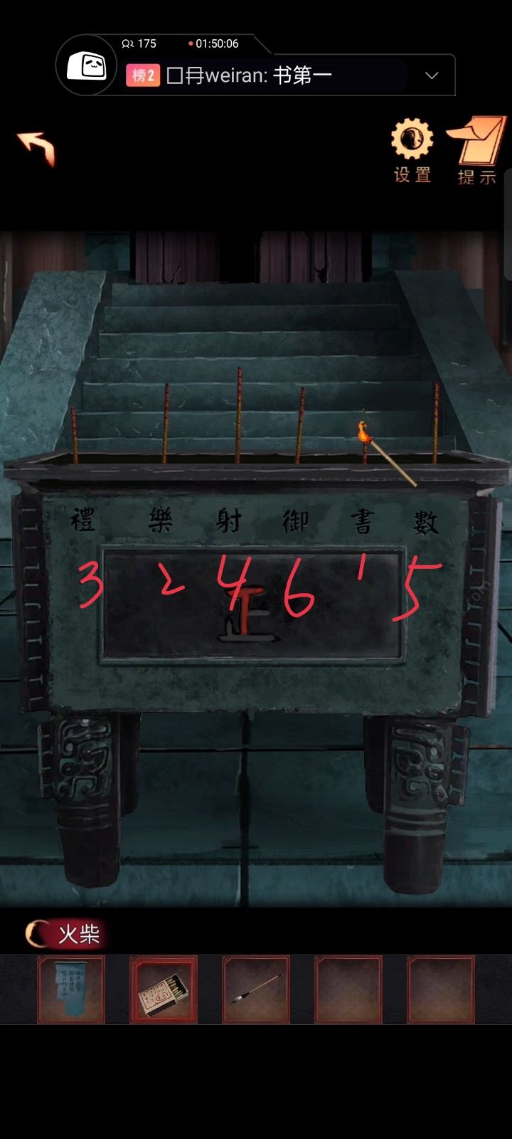 探索完差不多整个庙后,看到四个正字,红色为笔画顺序,按照顺序可知是狮鼎黑白,(最后一个字我没看到)但是可以通过穷举法得出最后一个字是箱。锁在黑色道长门贴的大门