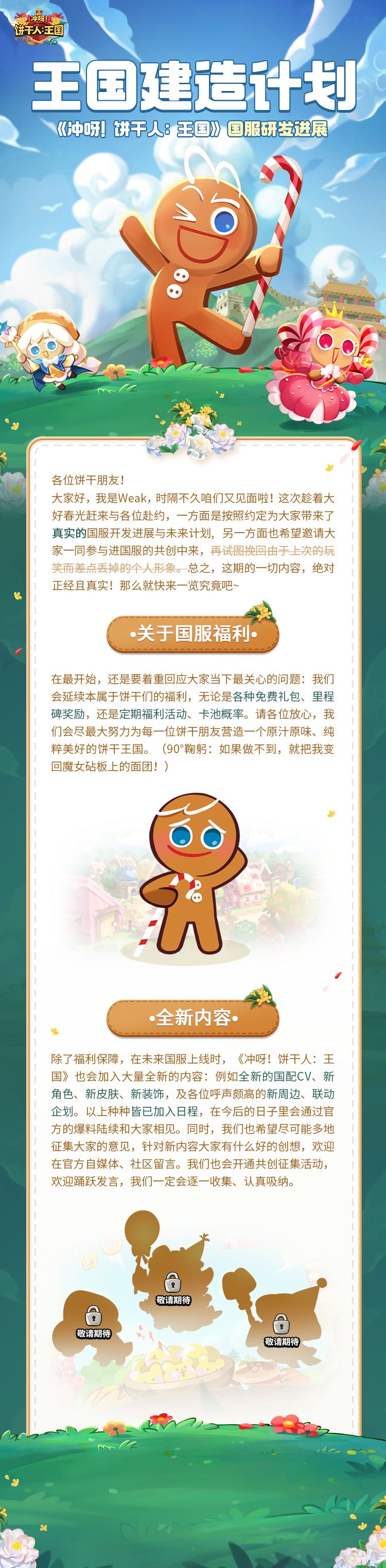 除了进展同步外,为了收集更多饼干朋友的想法,我们将开启「王国共创邀请」「王国实验室」两条通道,邀请饼干朋友对国服全新内容进行共创与调优。今后,请与我们一同打造繁荣的饼干王国吧!
