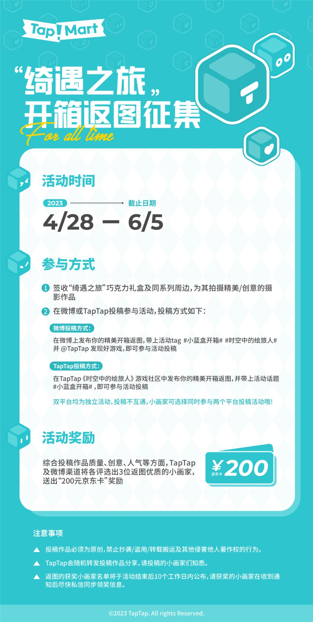 快来拍下你的创意开箱图,在TapTap《时空中的绘旅人》游戏社区发帖分享,并带上活动话题“小蓝盒开箱”参与投稿哦~有机会赢200元京东卡!
