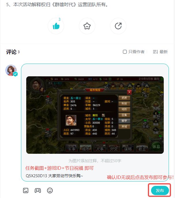 1、请各位主公在活动期间按照格式进行回复。过期或与主题无关的回复内容,将不计入参与活动;