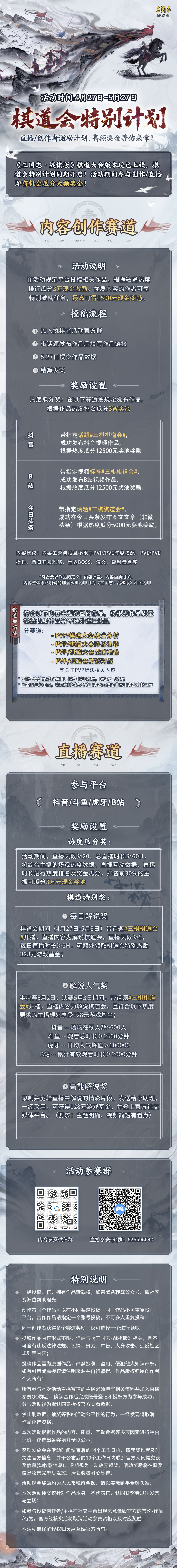 为了给主公们展示自己的睿智对局、精彩瞬间,棋道会版本直播/创作激励计划现已开启。