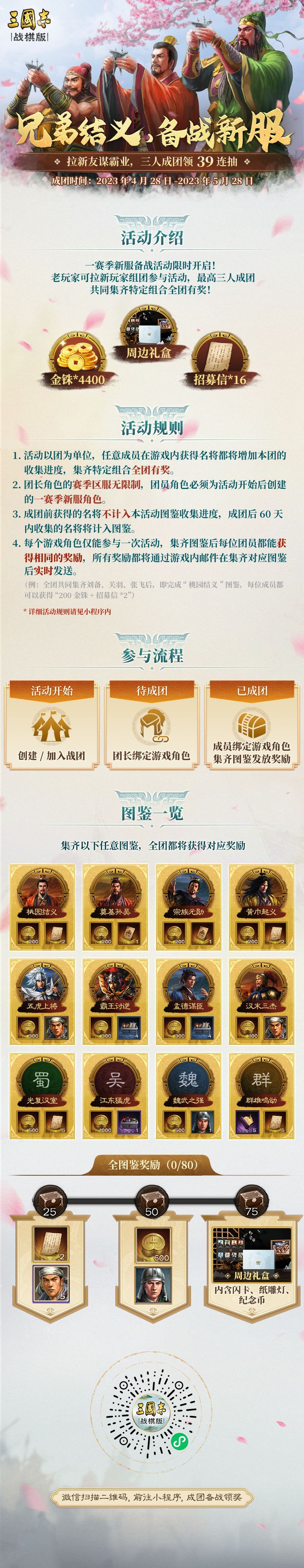A:是所有人一起集齐,比如团内有ABC三个玩家,A获得了刘备,B获得了张飞,C获得了关羽,那么这个团就算集齐了刘备、张飞、关羽,解锁“桃园结义”图鉴,每个人都能获得“金铢*200、招募券*2”