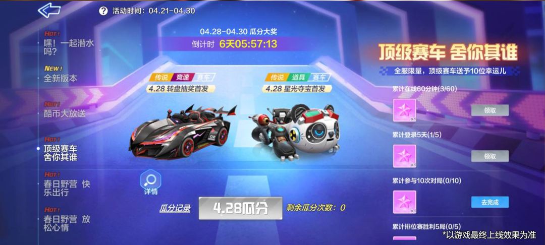 4月28日-4月30日登录游戏即可参与瓜分活动,有机会获得本期永久赛车【黑影骑士】、【机械熊猫】、电池、星愿结晶、酷币等奖励!车友们别错过啦~