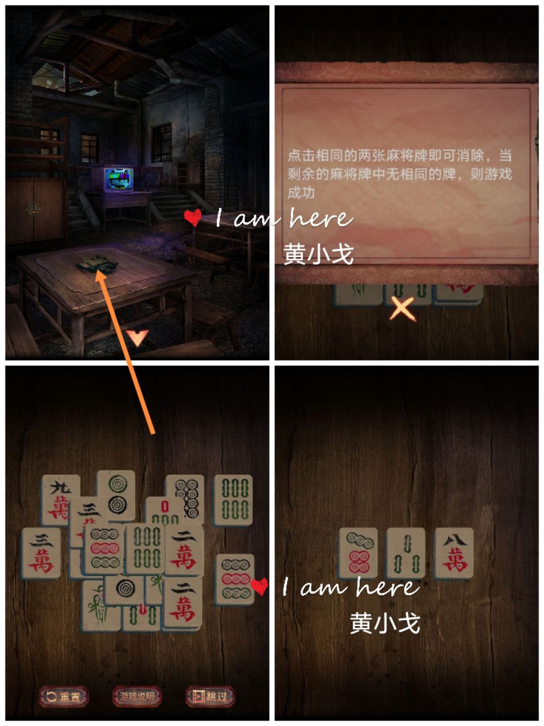 7.(巷子1-茶馆)点击桌子上的麻将,查看游戏说明,完成小游戏,剩下三个麻将:七筒、三条、八万