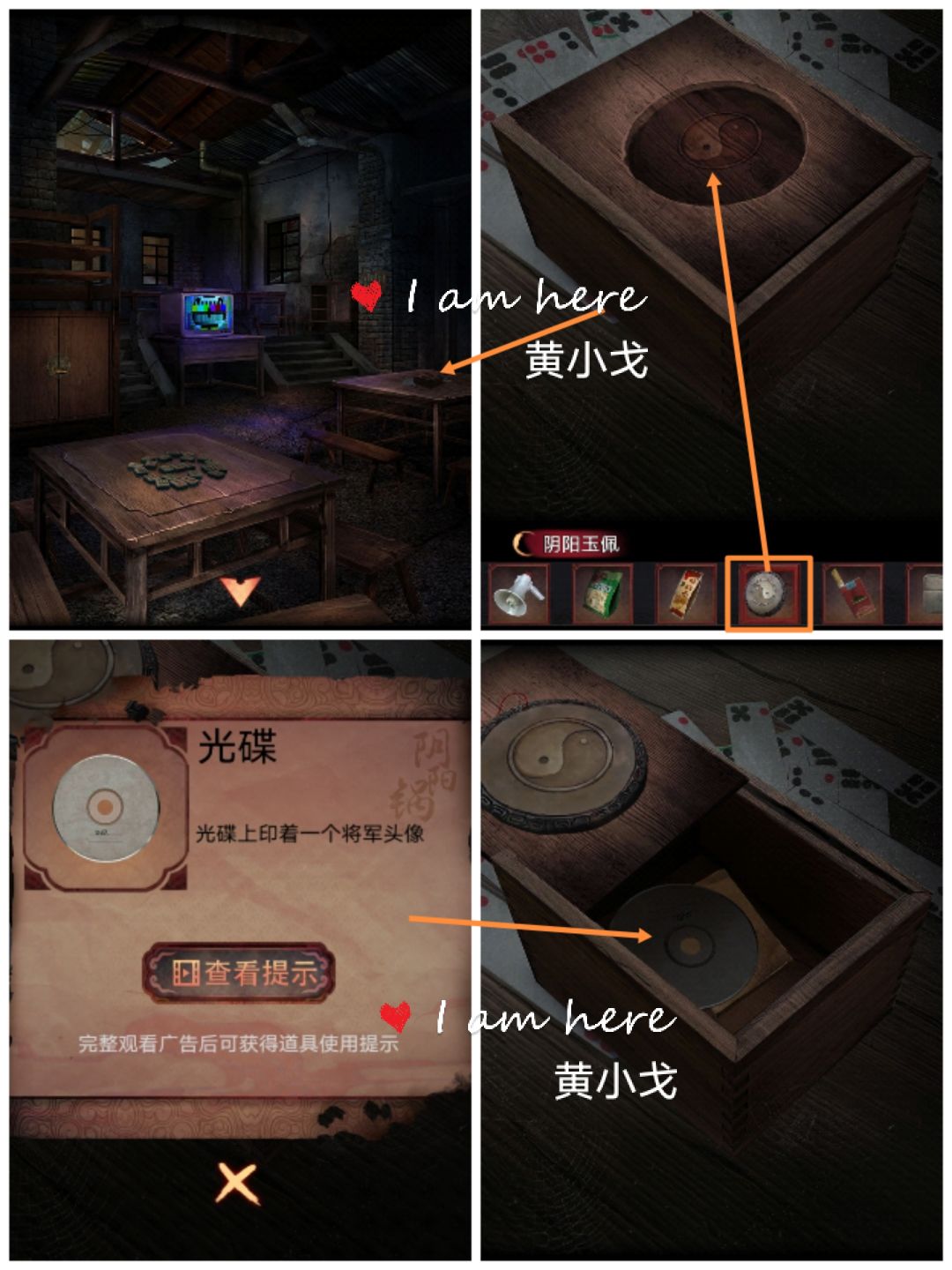 8.点击右边桌子上的盒子,把【阴阳玉佩】放入凹槽处,盒子打开,获得【光碟】