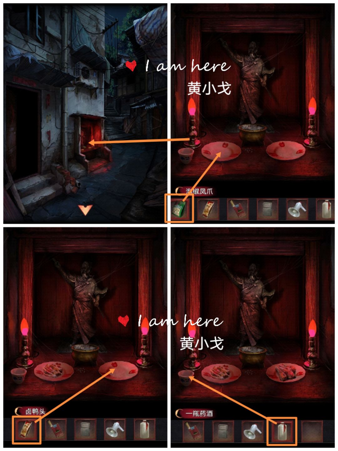 21.(巷子2)点击小庙,放上【泡椒凤爪】和【卤鸭头】,把【一瓶药酒】倒入空酒杯