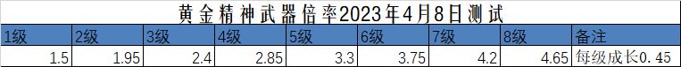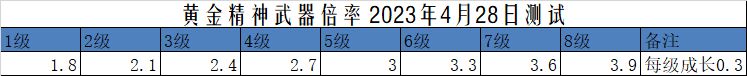 2023年4月28日更新后测试黄金精神武器倍率如下图