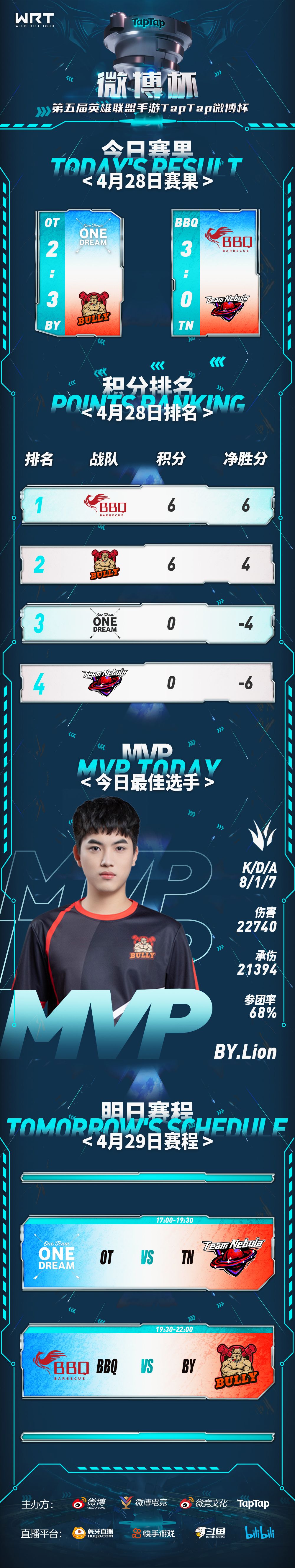 4月28日,第五届英雄联盟手游TapTap微博杯小组赛Day5战罢,赛果如下: