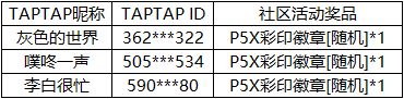 恭喜以上三位队长,获得P5X彩印徽章[随机]*1,请务必在3个工作日内加入官方QQ群,联系管理员提交社区ID、个人信息截图,以及中奖通知截图,我们将核实您的身份后,在30个工作日内寄出奖品。