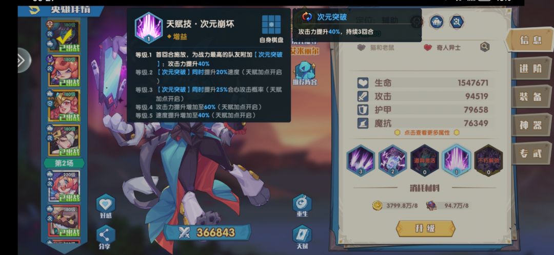 最后是聊胜于无的升星技,提供低血量额外治疗,和击败全队回血回蓝,算是添头吧,除了巨巨巨佬不会有人在一个辅助上面投入这么多升星资源。