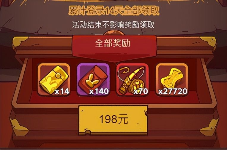 因为充值是有返利的,充的越多,拿到的金礼包越多,金礼包越多,开出的金豆越多。如果你平常的通行证都买了的话,那么本次的福卡活动198的奖励是必拿下的,囤鱼竿的速度直接快一大截。(如果想要囤资源拿金鱼的玩家,这70金鱼竿是必拿下的)
