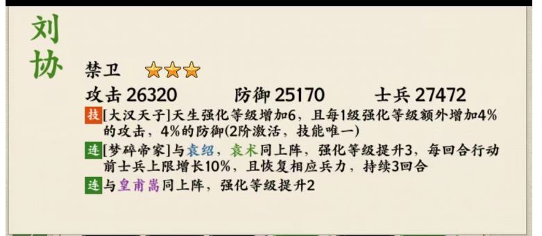第二顺位为刘协,刘协的大汉天子是最强推图绿卡技能,没有之一,所以是前期必升3星的卡片,刘协3星的优先级在马岱3星之后,马岱五星之前,马岱五星之后需要考虑刘协5星了,但刘协基本上不考虑在推图中升级到3阶。