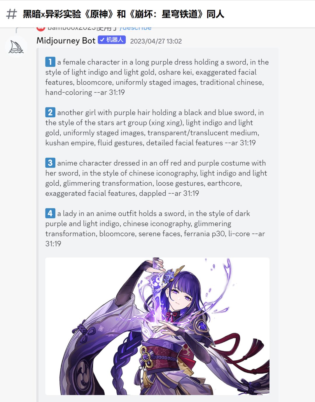 生成图的风格已经很像雷电将军了,只需要用PS或手绘工具把头换成雷电将军的头就行了,关键是要画好头发的颜色和眼睛的颜色。当然,也可以用Stable Diffusion这个ai软件来修改,因为雷电将军的模型已经有很多了。