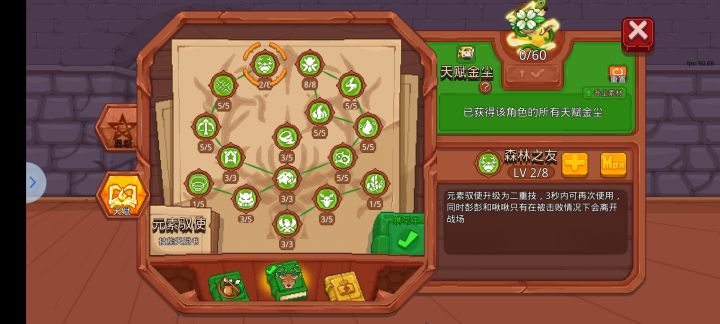 2、天赋:精灵系点满,然后猪和鹰点出主动技能,剩下的点出主动二次释放,保证召唤物全程存在,余下点延迟召唤物时间,解释一下为什么这样点的原因,舍弃了主动技能进阶版是因为这套输出的方式主要靠符和地火闪光弹高频触发,冰龙和精灵以及猪鹰都是为了更好的触发黑洞类卡组增伤用的,本身他们的伤害只在第一大关有用,只需要他们全程存在蹭伤害频率就行了,因此这样选择,召唤物增加时长8秒和12秒实际效果区别不大,最后一点不点主动原因是老乌会开盾召唤多只小猪一起打只会让它回血,经过多次实验,舍弃一图的主动伤害释放,保证全程都存在的猪和鹰效果更佳,打BOSS也更快。