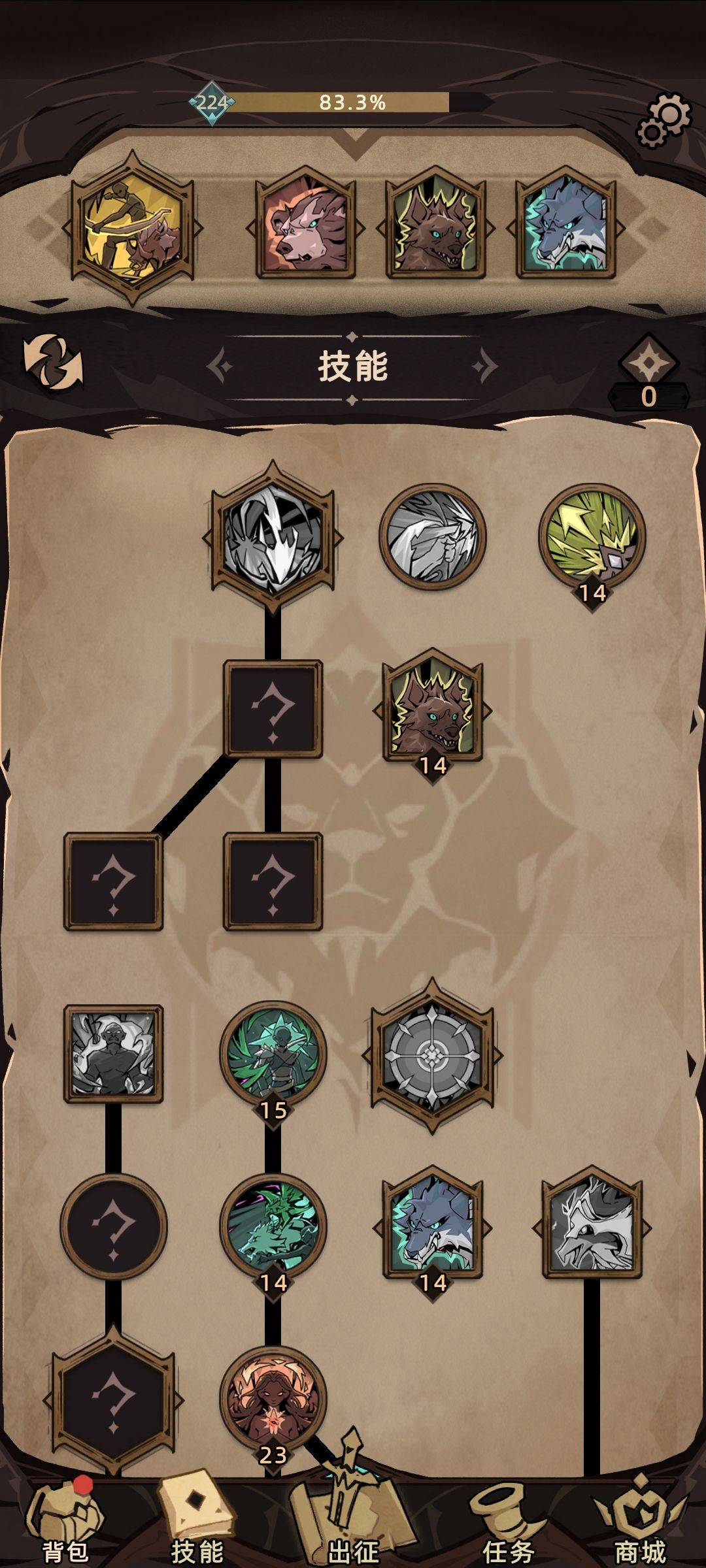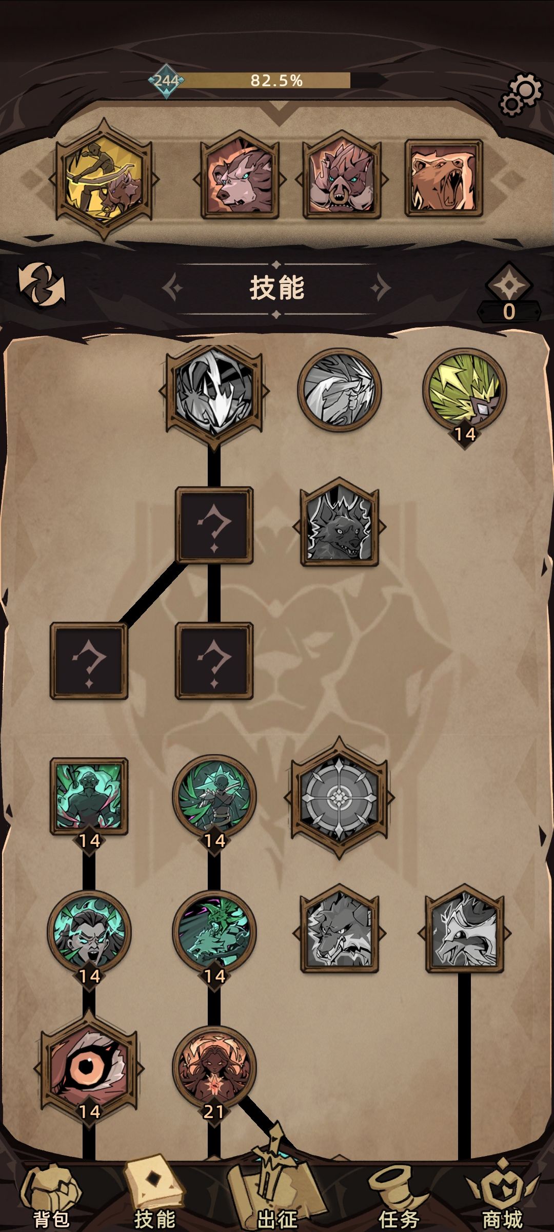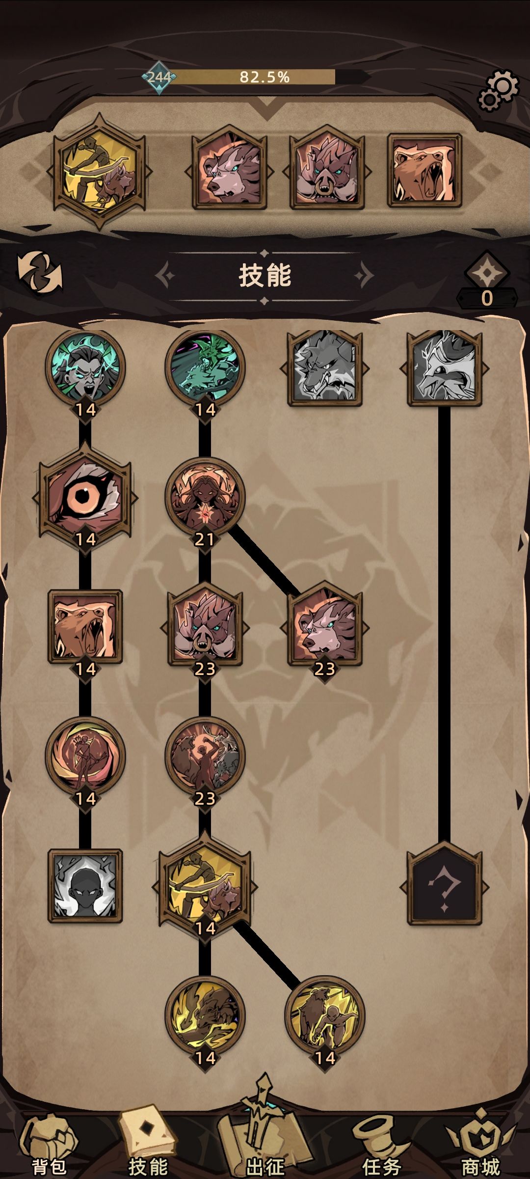 推图技能加点如下,一熊两狗,一狗奶自己一狗奶宠物,或者一熊一猪一狗,自己活下去是最主要的。这一套负责打些简单关卡和boss,推不动的关卡可以先留着换下一套加点