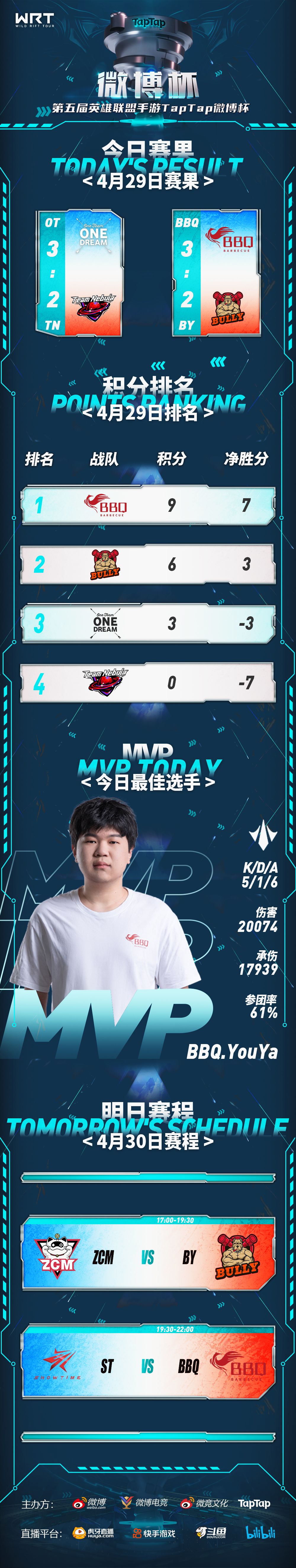 4月29日,第五届英雄联盟手游TapTap微博杯小组赛Day6战报,赛果如下: