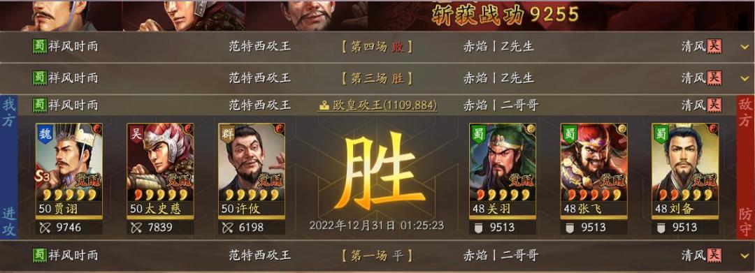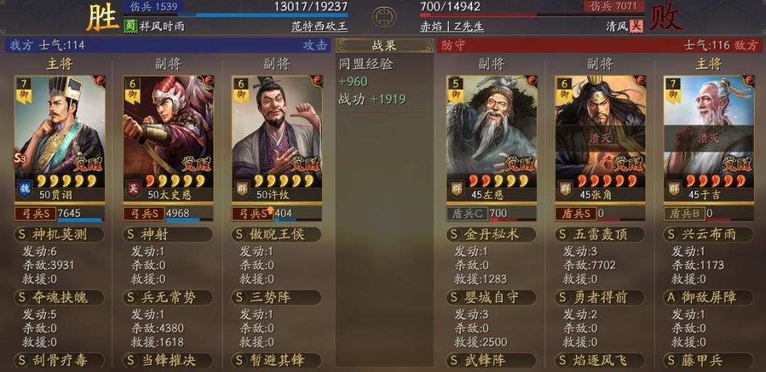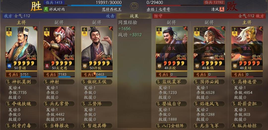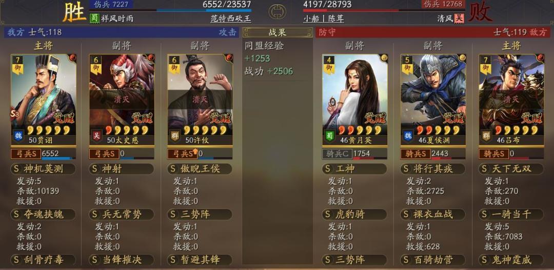 可能是自己太过于孤陋寡闻,以贾诩、太史慈、许攸组三势弓,真的是第一次见。贾诩玩的是弓兵本来就少见,“废柴”许攸居然都能出场,更为罕见。本套阵容源自2666区的范特西砍王,一个赛季就这一套主力,硬是吃到了近200万的战功,不得不令人刮目相看。