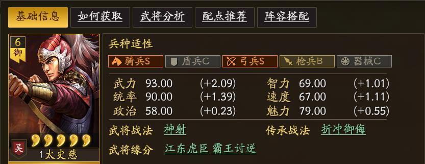 居中而立的太史慈,颜值与实力并存,智勇兼备,曾与小霸王孙策酣战,不分伯仲。也曾单骑闯重围,只为救那三岁就懂得让梨的孔融小哥。游戏中的他是吴国万金油般的存在,最早的甘太程,后来的肉弓,甚至吴骑、各种三势阵都能搭配。有了他就等于有了“咔咔咔”暴力连击,搭配其他战法还能降统帅、降智力,是真正的输出核心。