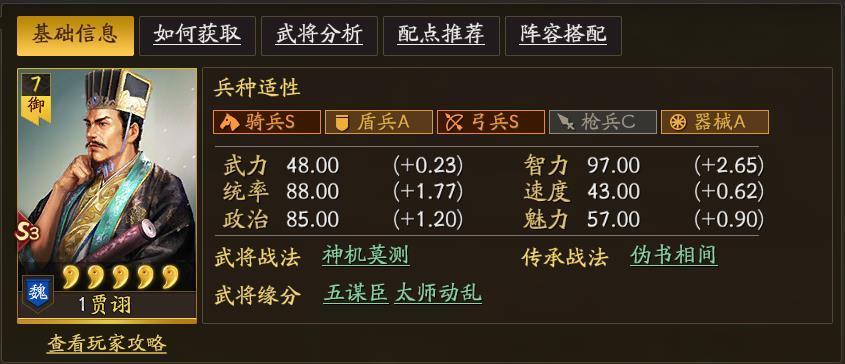 先看主角贾诩贾文和,三国时代著了名的“毒士”。李郭之乱,司徒王允坠城身亡,奉先同志弃城而逃,拜谁所赐?宛城之战,曹老板痛失长子曹昂、侄子曹安民、爱将典韦,拜谁所赐?潼关之战,马孟起与韩遂反目成仇、丢妻丧子,拜谁所赐?统统都是这位老兄的杰作。游戏中设计也非常符合他的特点,无论是自带战法神机莫测,还是传承战法伪书相间,就是给人制造混乱。超高的智力,超强的战法,常常“混乱出奇迹”,伤害真不一般。