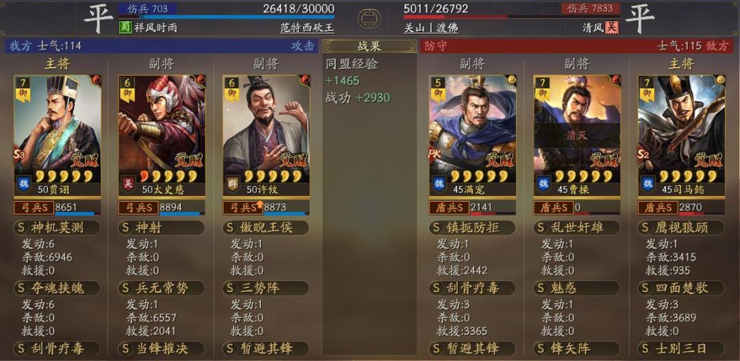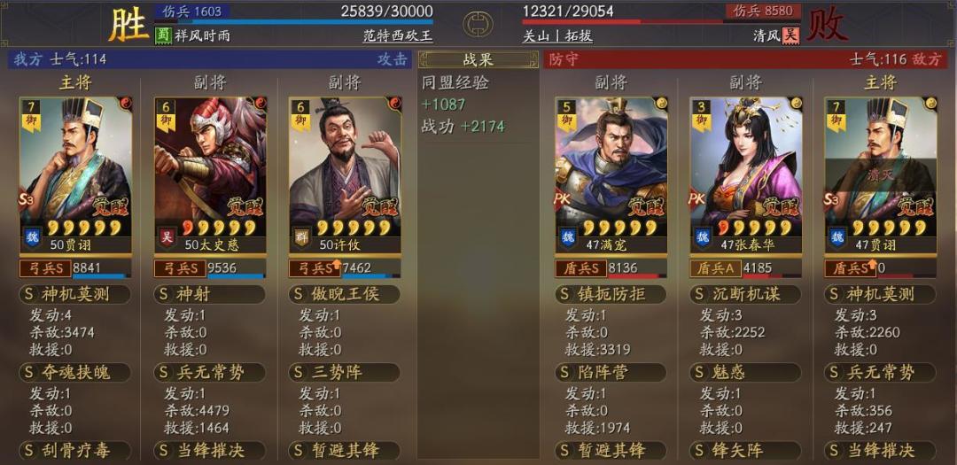 总体来说,在打一些中慢速的队伍还是比较给力的,还能常常逆兵种反克盾兵,单穿能力也比较强,基本上能打5000以上战功,偶尔也能破万。这对于武将有限、红度不高的玩家来说,无疑也是一项好的选择。谁又敢说PK赛季只能是满红的天下,在豹子区的白板也能成为抗红斗士!