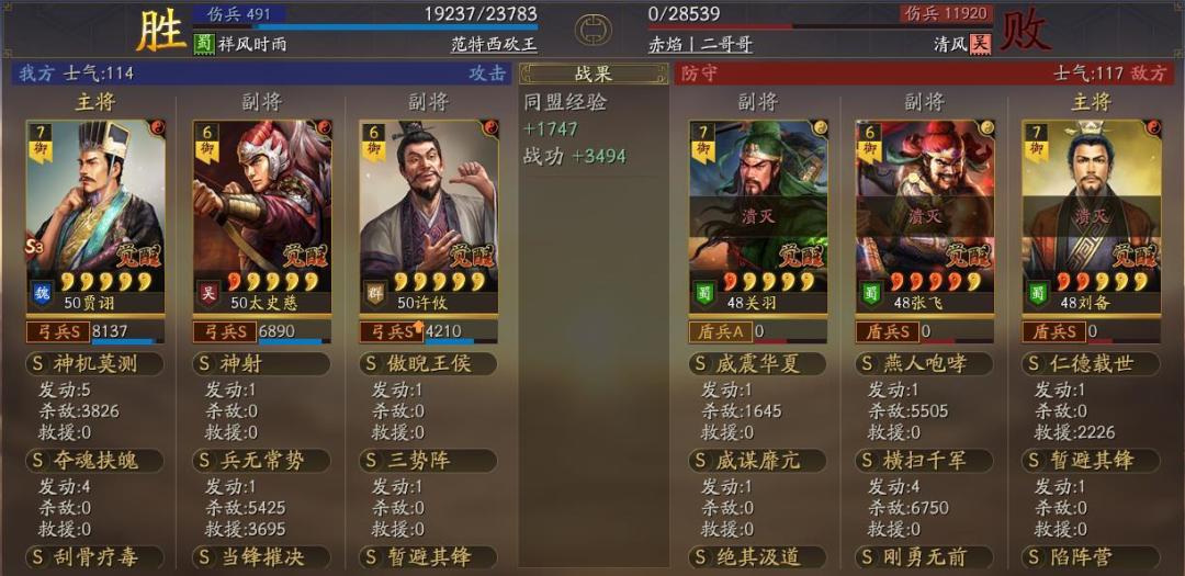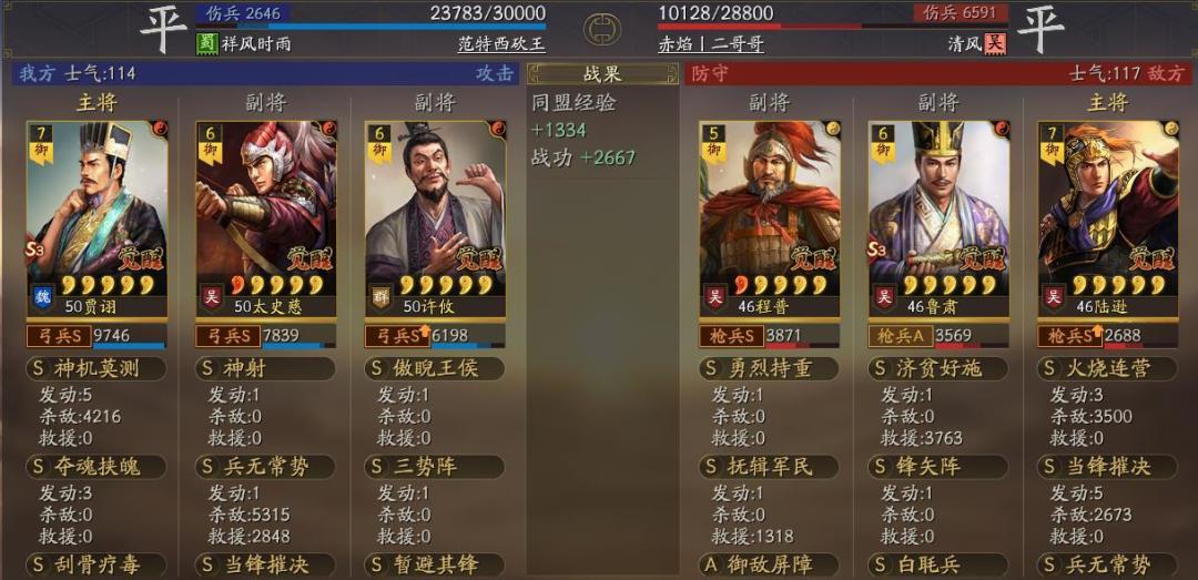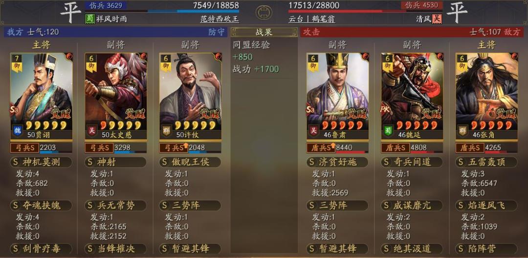 许攸战法的激活条件是依靠普攻,而太史慈的神射能够连击,两者非常搭。甲鱼配上夺魂,继续降维打击,刮骨、暂避和三势阵的减伤能够很好的保护许攸相对脆弱的身板。太史慈作为主要火力点,当锋兵无也算标配战法,场均伤害在15000-20000。