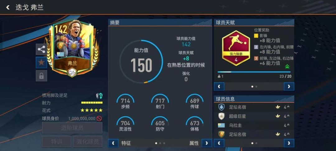 数据方面,足坛名宿弗兰的基础能力值为142,天赋给到强力锋霸,提升了他的加速、射门、抢点、头球、力量五项进攻关键属性。弗兰步频短且快,在盘带和控球数据上也高达700,710的双速让他的爆发和前场冲击能力堪称顶级。