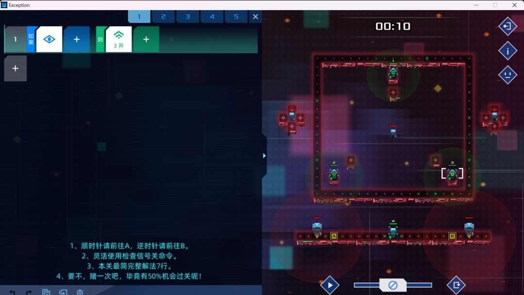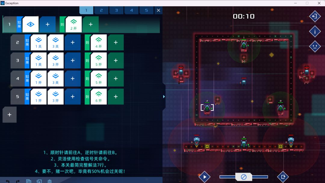 共计17行代码,通过率不为100%(如果到时间敌方蜘蛛没有经过监察1、2的范围,士兵4大概率会被靠近点敌方狙击歼灭),详细解法如下: