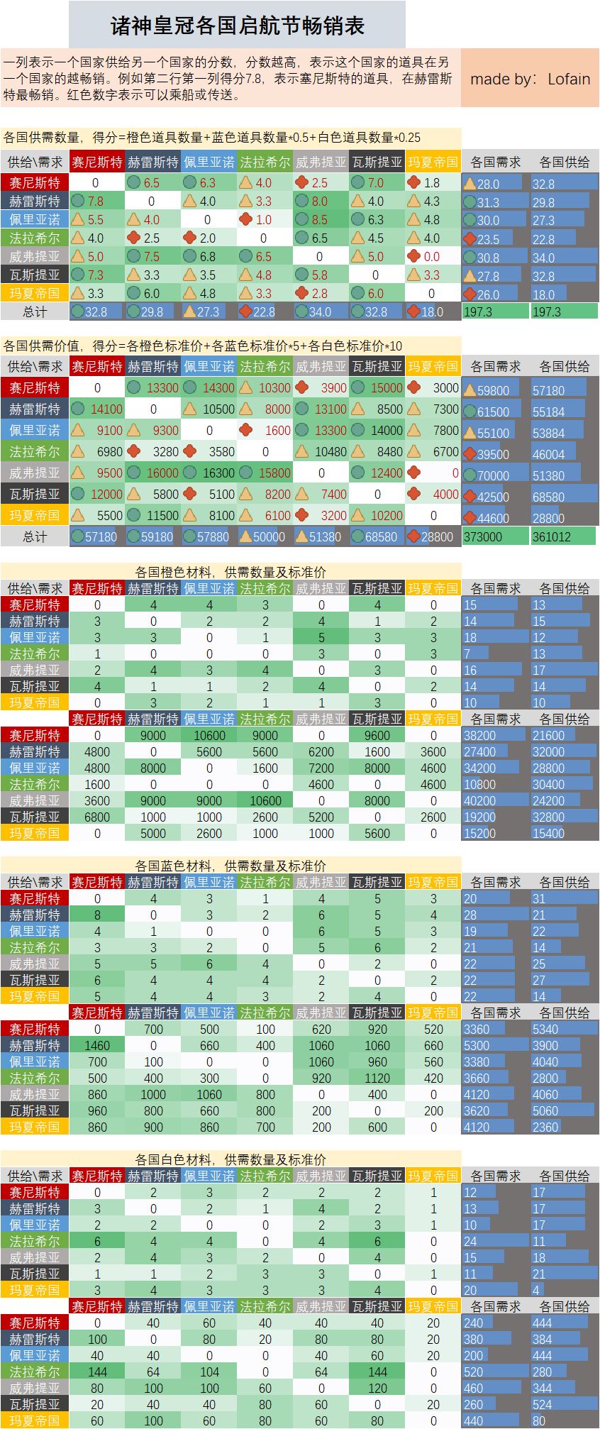 为了方便选择启航节在哪个国家过,于是我就制作这张畅销表,一个国家产出的商品越被另一个国家需求,畅销分数就越高。从道具加权数量上看,牛头的商品是最畅销的,其次是塞宁和切瓦。希尔是最好卖东西的,其次是牛头和配尔。