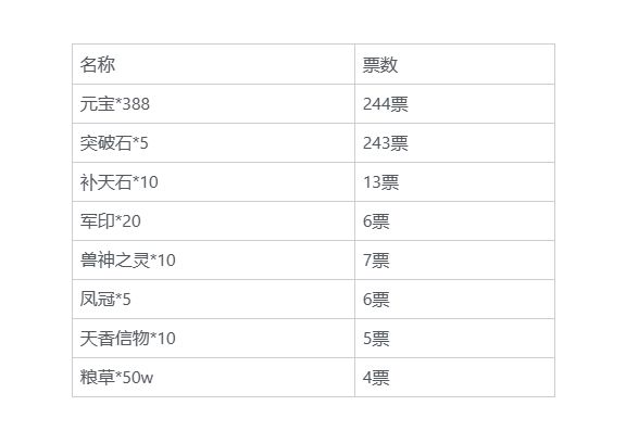 经过大家的票选,最终得票最多的2种道具:元宝*388、突破石*5